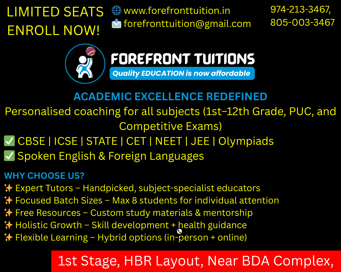 Forefront Tuition connects students with experienced tutors for personalized home and online classes. With over 13 years of academic excellence, we support learners across CBSE, ICSE, State, IGCSE, IB, NIOS, engineering, and graduation levels. From school subjects to competitive exam prep, our result-focused approach has helped hundreds succeed in IIT, NEET, and more.